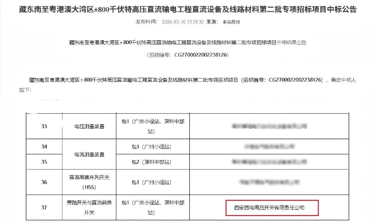 (陆平)近日,西开有限成功中标南方电网藏东南至粤港澳大湾区±800千伏特高压直流输电工程受端换流站旁路开关、直流转换开关项目。此次中标不仅是南方电网对西开有限技术实力与产品品质的高度认可,更是企业在特高压直流装备领域深耕细作、持续突破的重要成果。